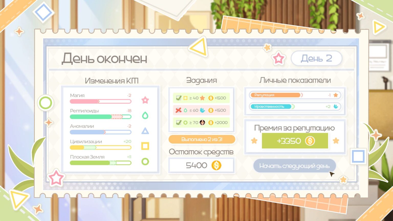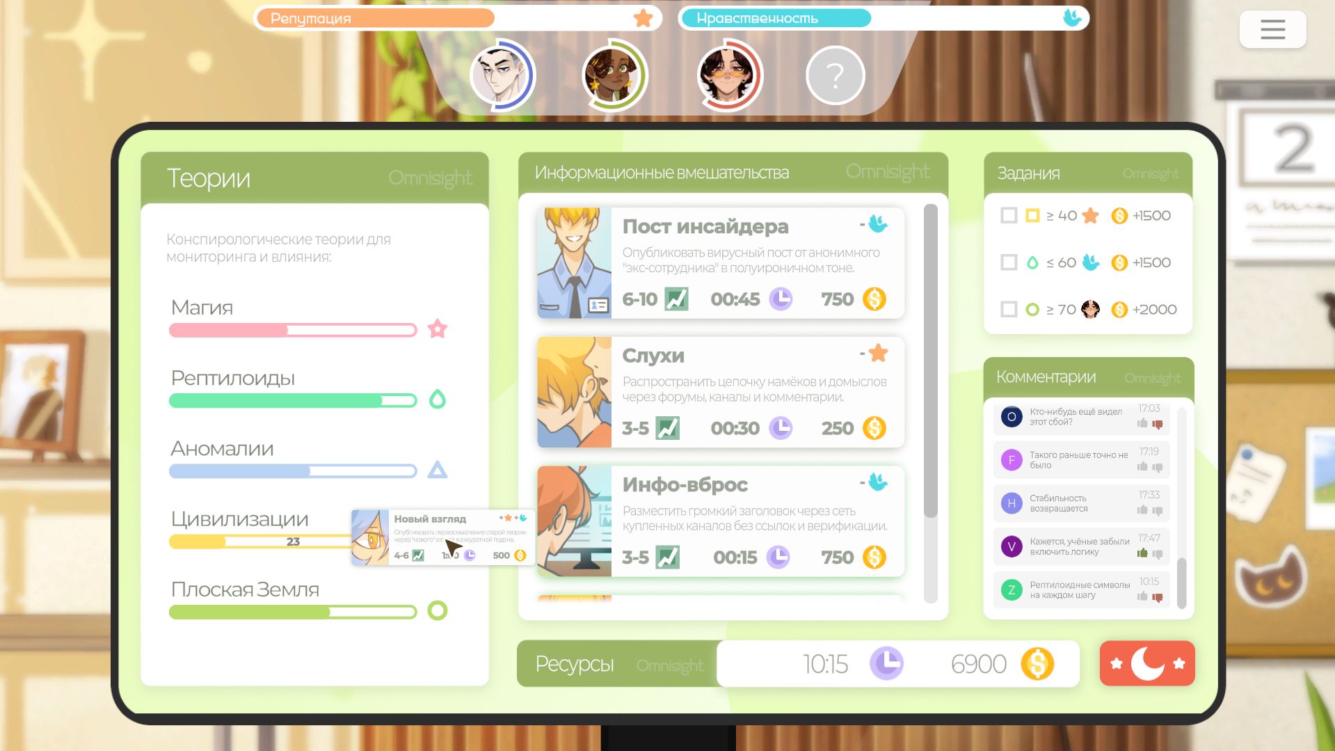 Выполняйте задания от корпорации и коллег, чтобы заработать дополнительные деньги, и следите за комментариями от людей - даже маленький лайк или дизлайк может помочь удержать баланс.