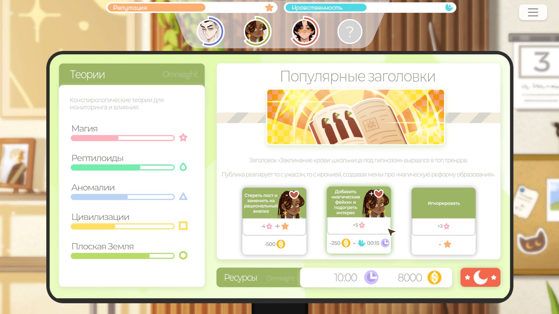 Используйте «Информационные вмешательства», чтобы управлять интересом людей к той или иной теории. Каждое вмешательство требует определённого количества ресурсов (денег и времени), поэтому их придётся выбирать с умом!