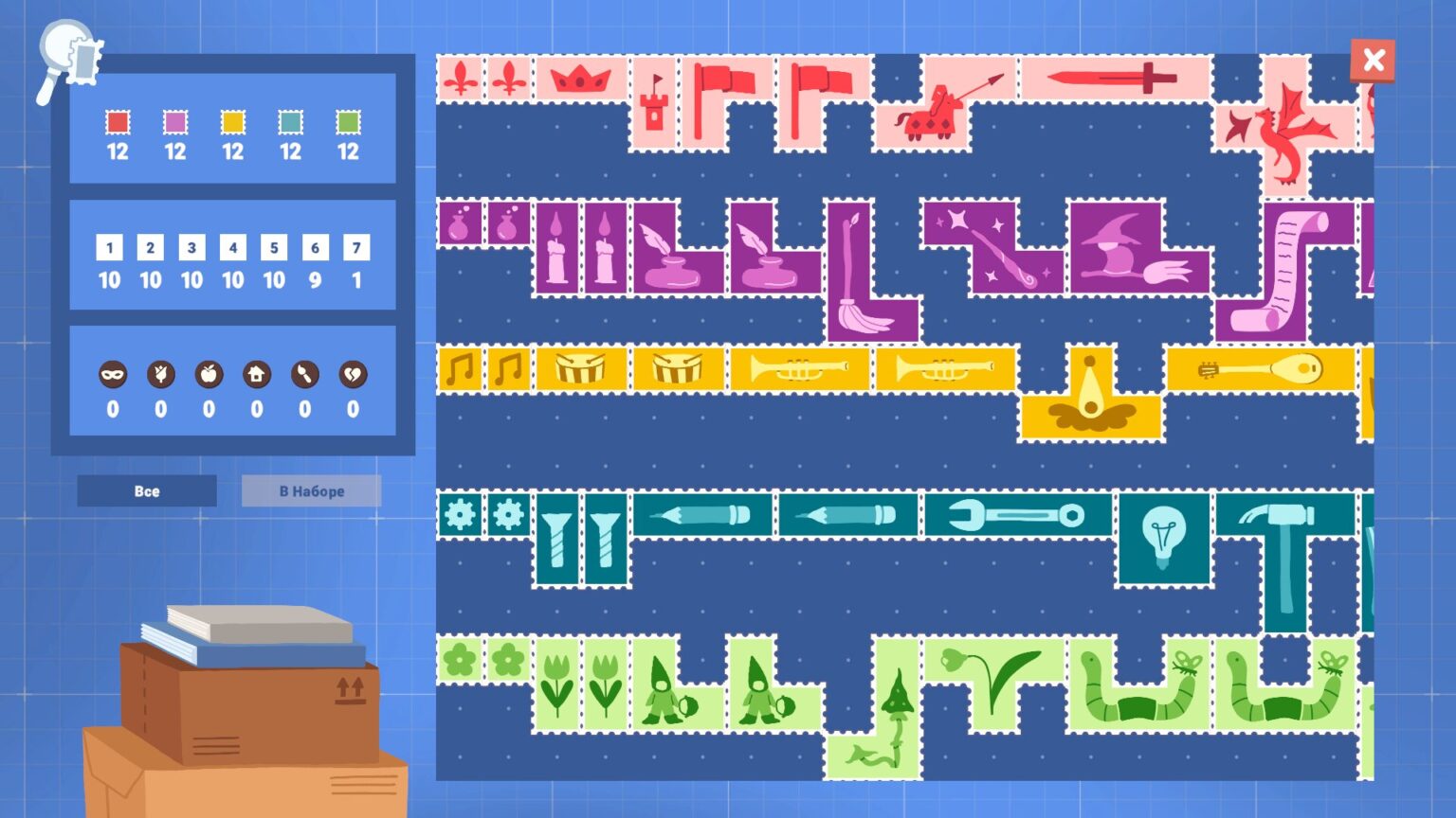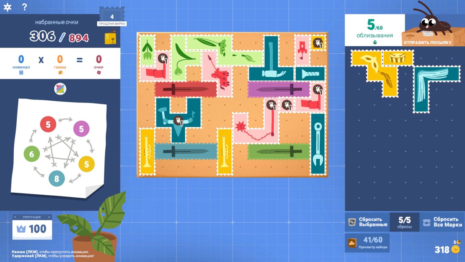 Головоломка-рогалик, где нужно клеить марки разных форм и размеров для набора очков и отправки посылок.